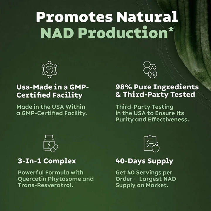 Enriquecido con una mezcla única de nicotinamida ribósido, este suplemento es el secreto para potenciar los niveles de NAD+ en tu cuerpo. Mientras disfrutas de su consumo, notarás un aumento en tu energía y concentración, lo que te ayudará a rendir al máximo en todo lo que hagas. ¡Prepárate para estar en tu mejor forma y aprovechar los beneficios de la salud general y el bienestar!